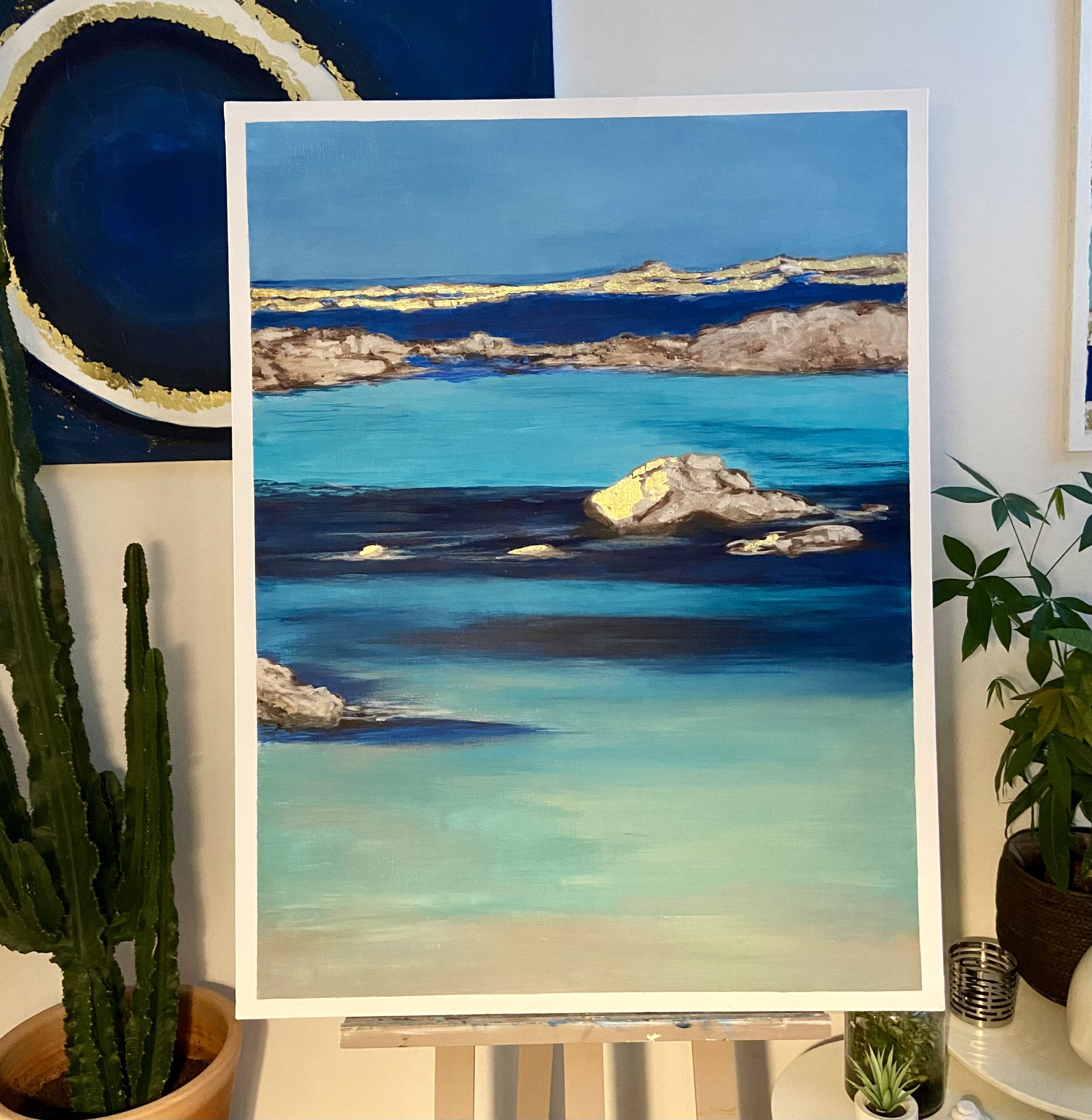 Acrylique et feuilles d’or sur toile de lin et châssis en bois 80 X 120 cms