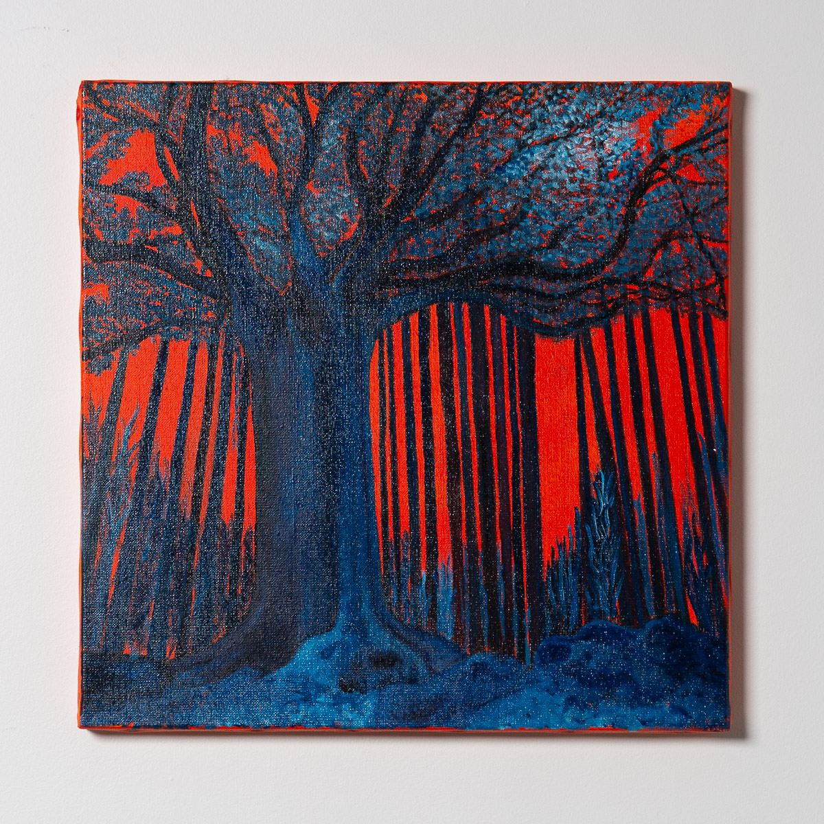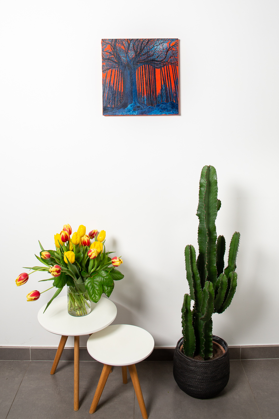 Sur fond rouge, un arbre majestueux et puissant nous invite à une rêverie mystique.