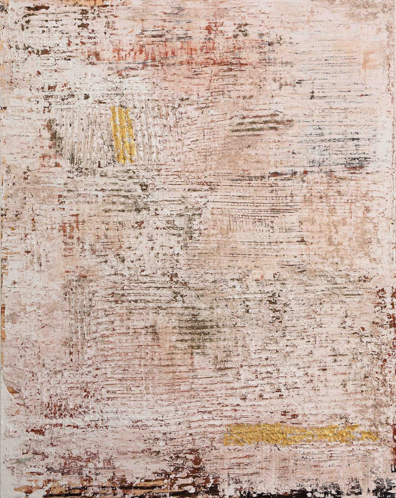 Enduits et pigments naturels mélangés à des sables pour créer des matières, des aspérités, des formes cachées, peinture à l huile or